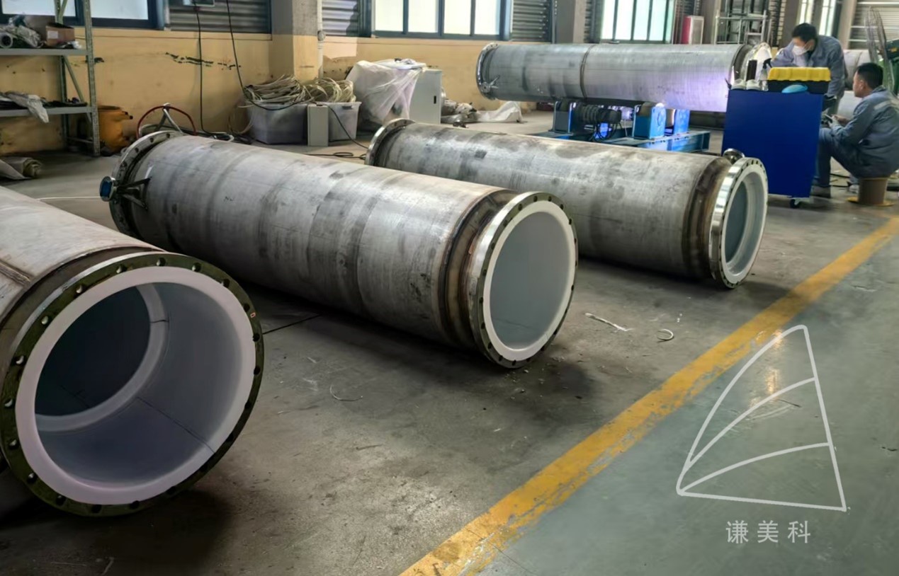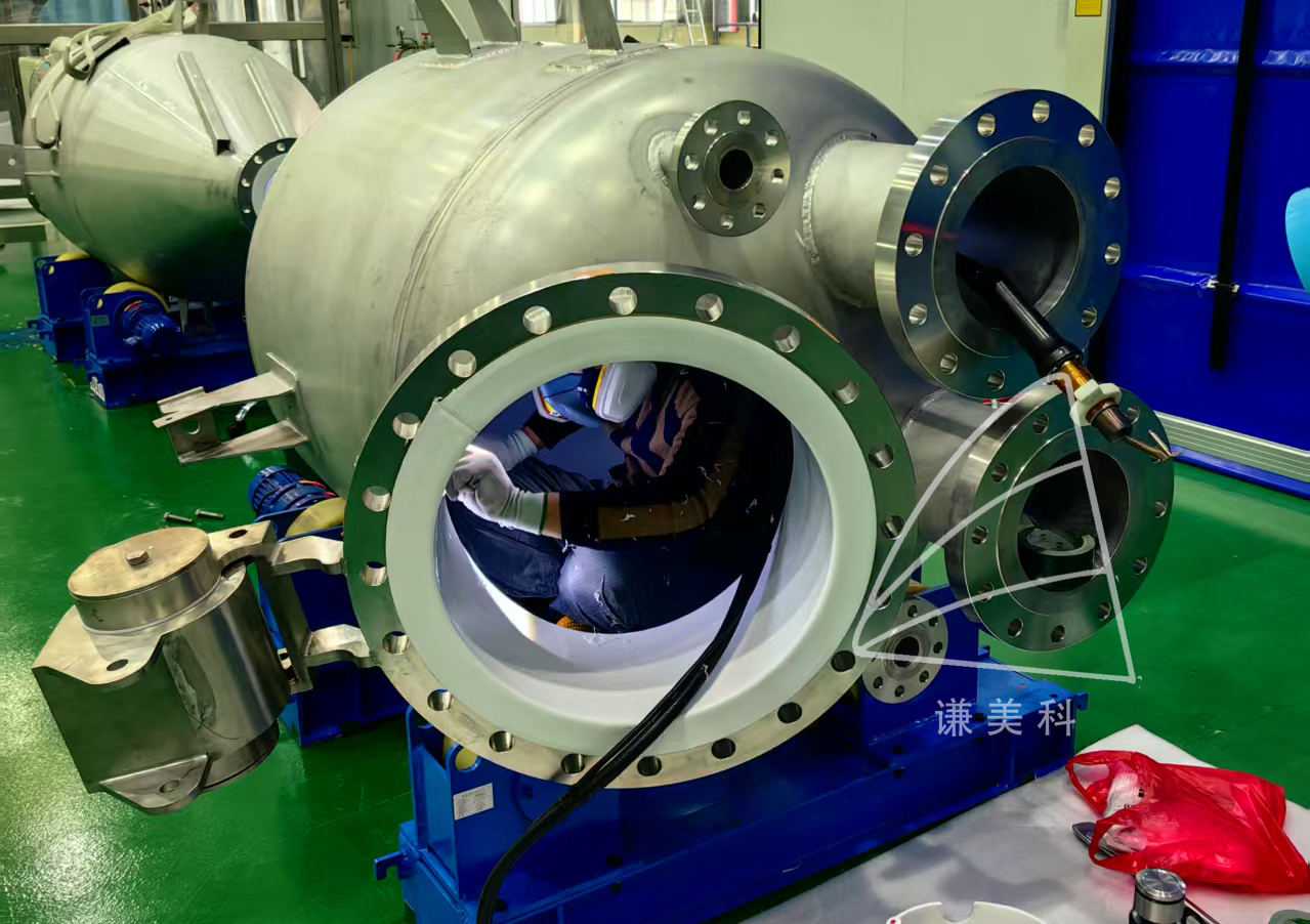 采用的工藝有板材緊襯、熱噴涂等,采用的材料有PTFE(聚四氟乙烯F4)、PFA、(可溶性四氟乙烯)、PVDF(聚偏氟乙烯F2)、FEP(四氟乙烯—六氟丙烯F46)、ETFE(乙烯四氟—乙烯F40)、ECTFE(三氟氯乙烯—乙烯F30)等各種氟樹脂。